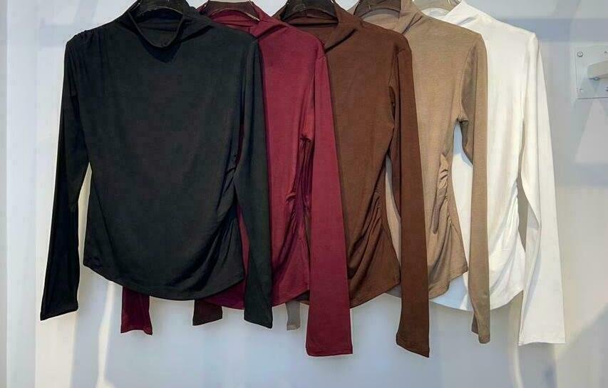 Blusa segunda pele com gola alta e detalhe lateral drapeado, que valoriza a silhueta e traz um visual moderno e sofisticado.