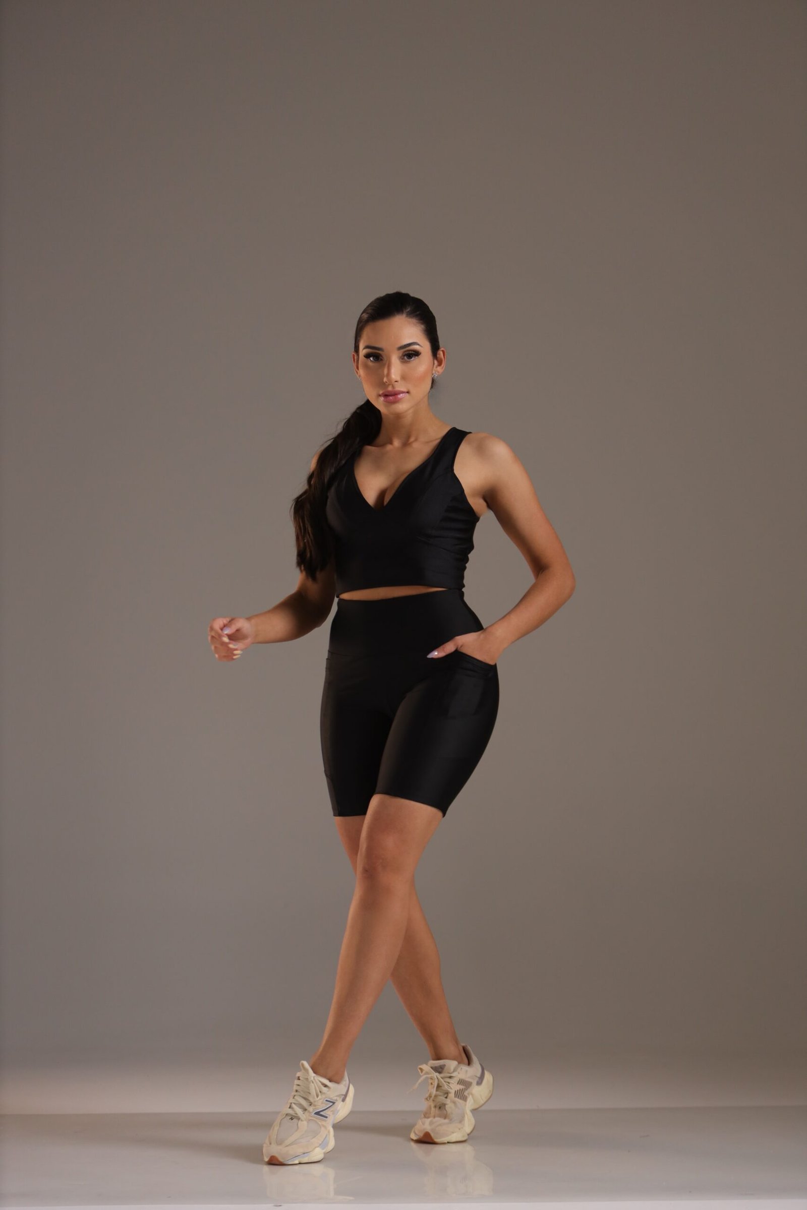 • Modelagem: cintura alta e bolsos laterais funcionais