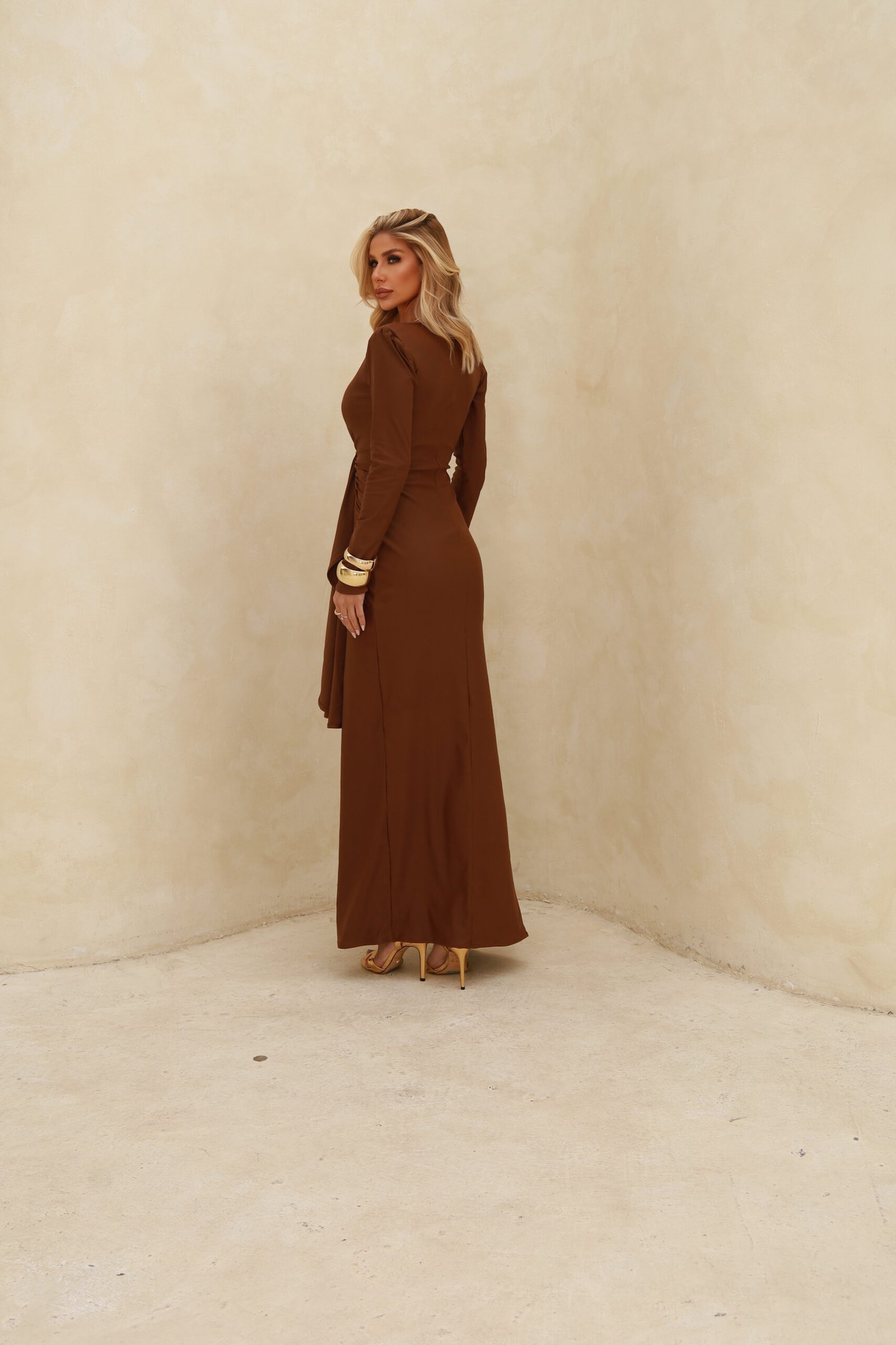 O modelo apresenta decote transpassado em V, ombreiras estruturadas que valorizam o visual, e um drapeado frontal com nó lateral, que realça a silhueta com sutileza e sofisticação.