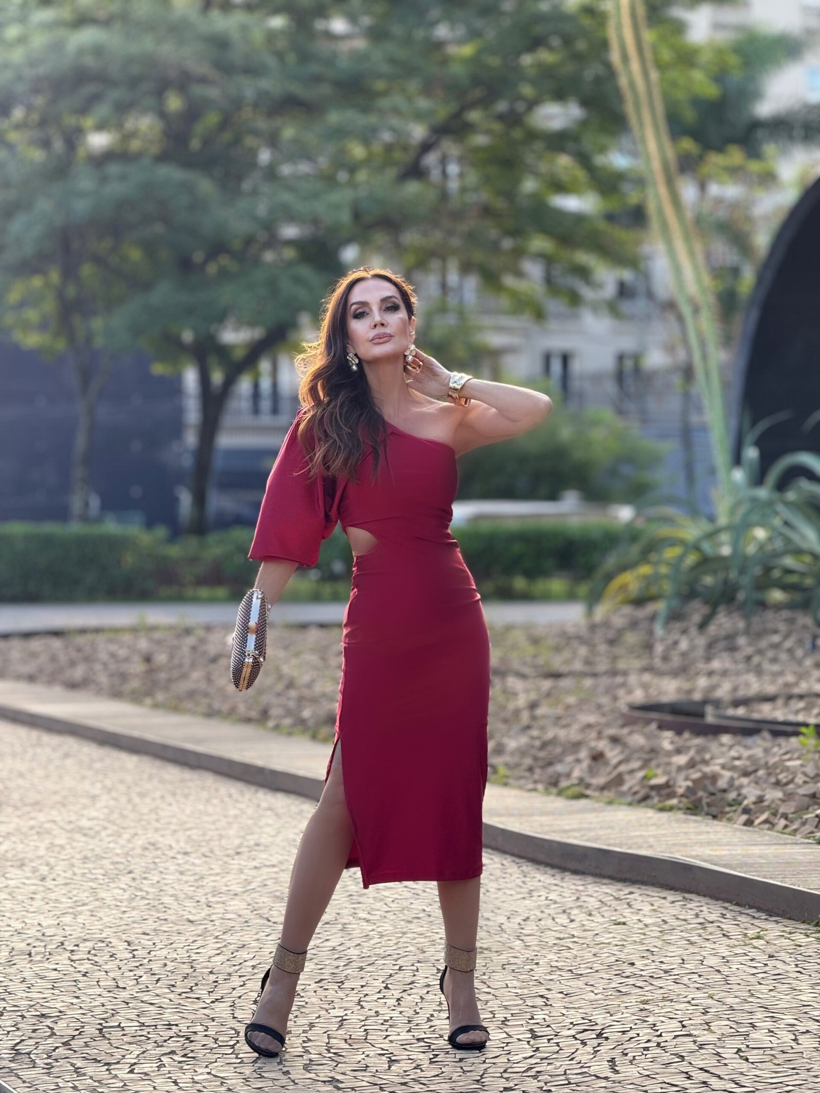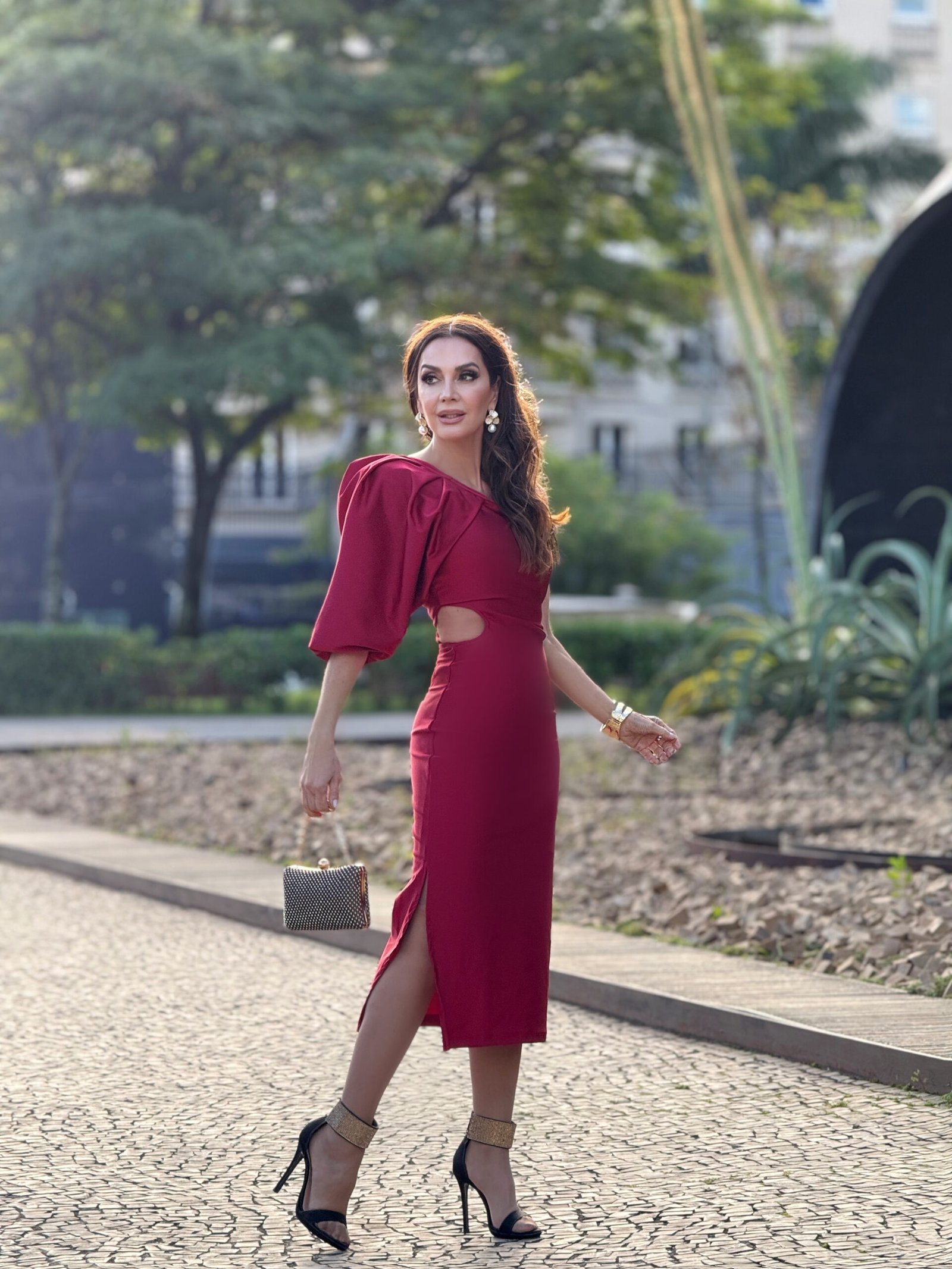 O destaque fica por conta das mangas volumosas estruturadas, que transformam o look com um toque fashion autoral, e pelo recorte lateral estratégico, pensado para afinar a cintura e criar um visual marcante — na medida certa. A fenda lateral completa a peça com sensualidade discreta e um caimento que acompanha o movimento do corpo.